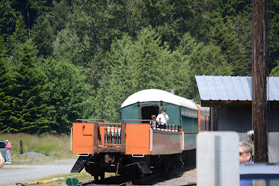 On Friday, we (me, Kyle, Kayden and Cindy) headed to a small town near Mt. Rainer, called Elbe for a train ride. Kayden is very much into trains right now, he even made a choo choo train out of all the shoes we have under our staircase. So, Kyle and I thought he'd have a lot of fun riding a real train. Elbe is about an hour or so away from our house, so we packed a picnic lunch and headed that way. We got there and unpacked our lunch. Kayden wasn't too interested in eating though, which isn't abnormal, the kid isn't a big eater! He wanted to pick flowers, he brought two back for me, Cindy and himself. He offered some to Kyle, but Kyle turned him down.